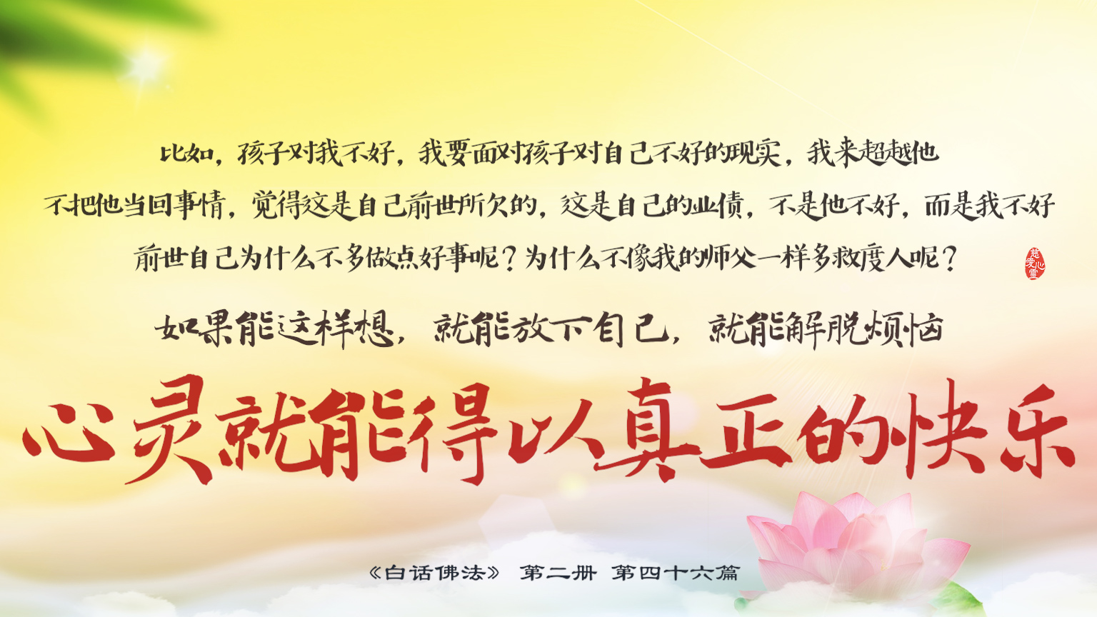 不限会员 2-46-16 比如,孩子对我不好,我要面对...现实,我来超越他...觉得这是自己前世所欠的...前世自己为什么不多做点好事呢?...如果能这样想,就能放下自己...心灵就能得以真正的快乐。.【图】