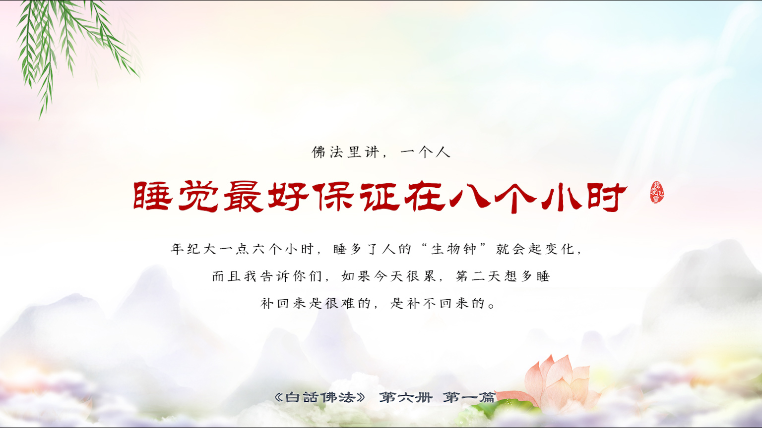 不限会员 6-1-22 佛法里讲,一个人睡觉最好保证在八个小时,年纪大一点六个小时,睡多了人的“生物钟”就会起变化,而且我告诉你们,如果今天很累,第二天想多睡补回来是很难的,是补【图】