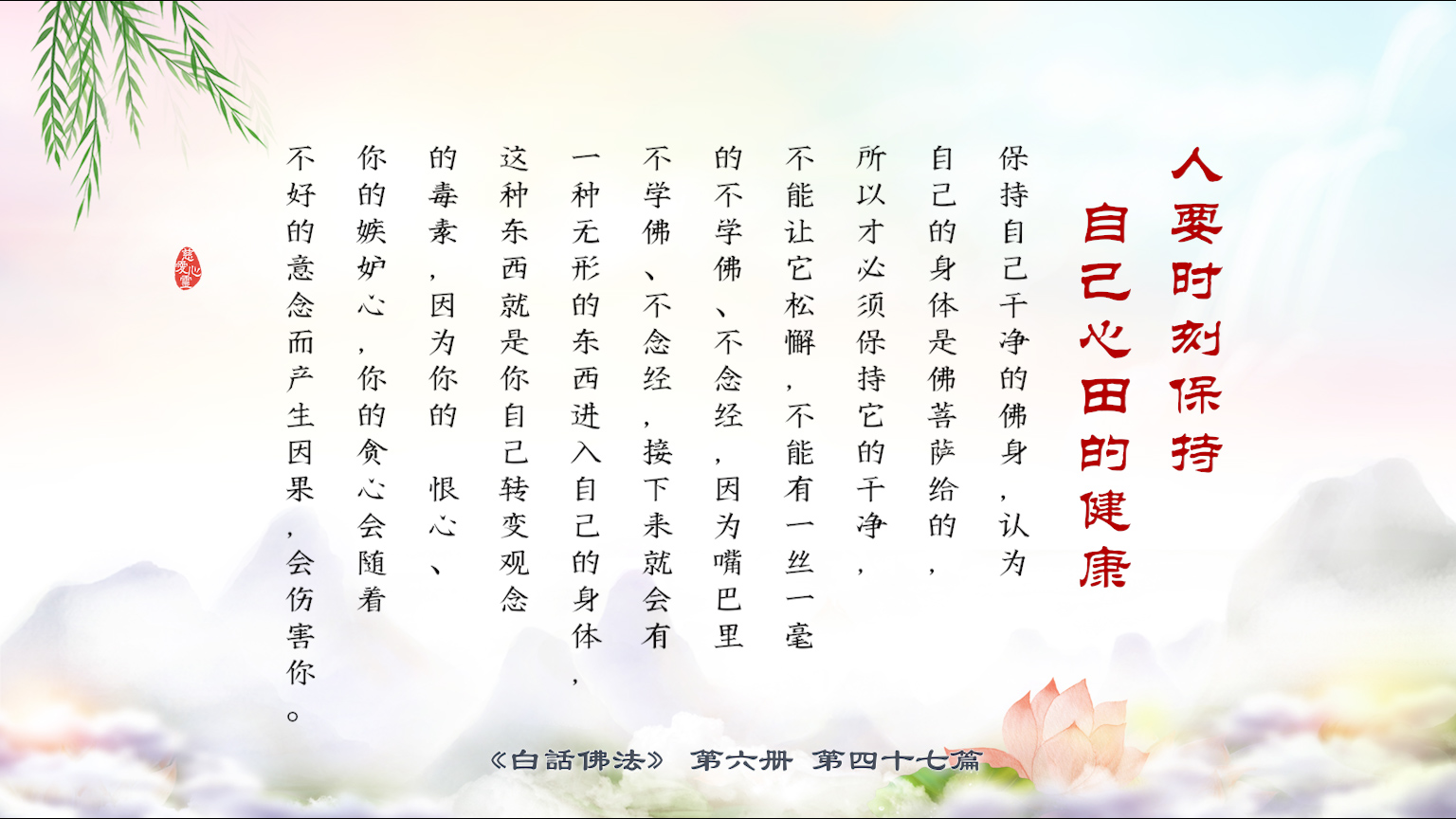 不限会员 6-47-29人要时刻保持自己心田的健康,保持自己干净的佛身,认为自己的身体是佛菩萨给的,所以才必须保持它的干净,不能让它松懈,不能有一丝一毫的不学佛、不念经【图】