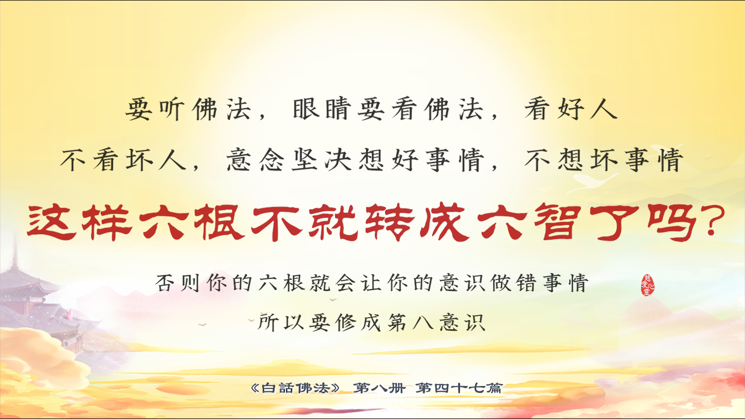 不限会员 8-47-7要听佛法,眼睛要看佛法,看好人不看坏人,意念坚决想好事情,不想坏事情,这样六根不就转成六智了吗?否则你的六根就会让你的意识做错事情,要修成第八意识。【图】