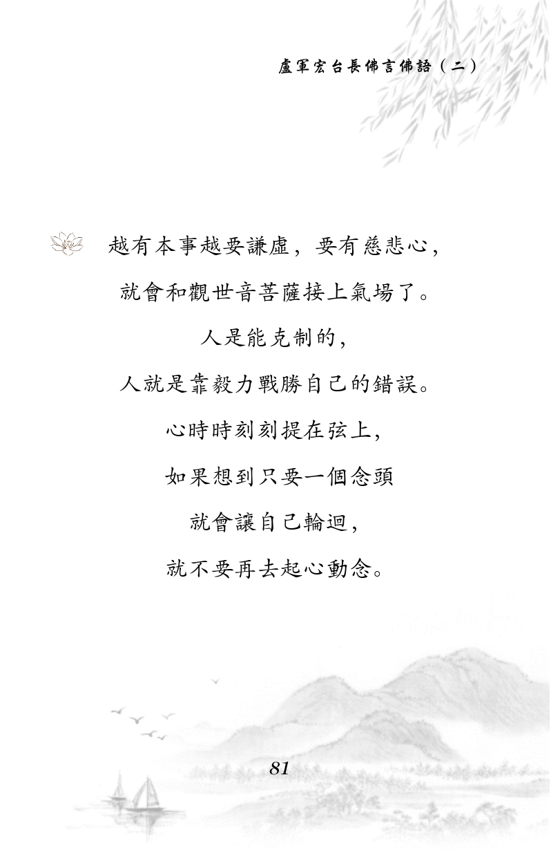 不限会员 越有本事越要谦虚,要有慈悲心, 就会和观世音菩萨接上气场了。 人是能克制的, 人就是靠毅力战胜自己的错误。 心时时刻刻提在弦上, 如果想到只要一个念头就会让自己轮回, 就不要再去起心动念。 |佛言佛语第二册