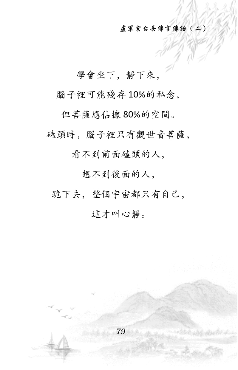 不限会员 学会坐下,静下来, 脑子里可能残存 10%的私念, 但菩萨应占据 80%的空间。 磕头时,脑子里只有观世音菩萨, 看不到前面磕头的人, 想不到后面的人, 跪下去,整个宇宙都只有自己, 这才叫心静。 |佛言佛语第二册