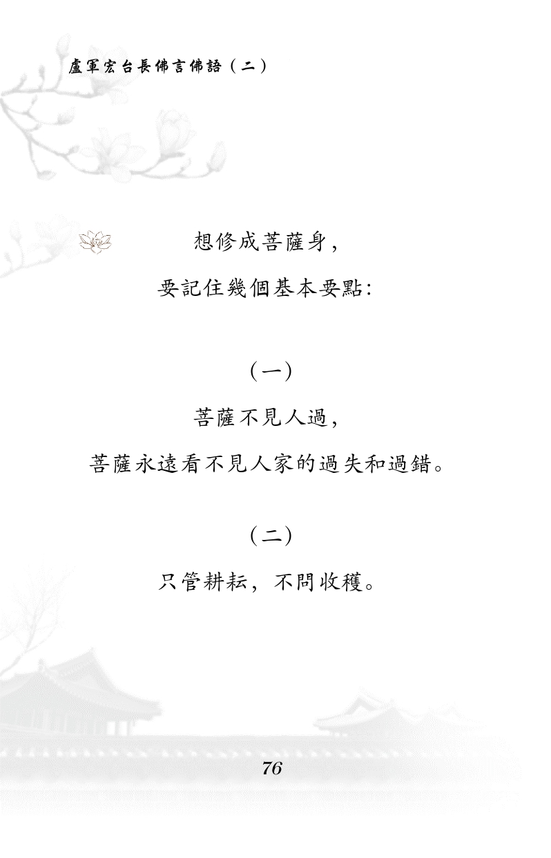 不限会员 想修成菩萨身, 要记住几个基本要点: (一) 菩萨不见人过, 菩萨永远看不见人家的过失和过错。 (二) 只管耕耘,不问收获。 |佛言佛语第二册