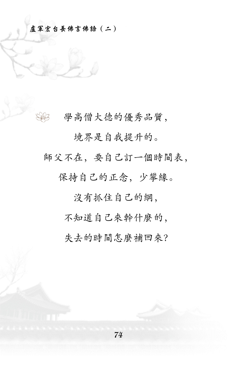 不限会员 学高僧大德的优秀质量,境界是自我提升的。 师父不在,要自己订一个时间表,保持自己的正念,少攀缘。 没有抓住自己的纲, 不知道自己来干什么的,失去的时间怎么补回来? |佛言佛语第二册