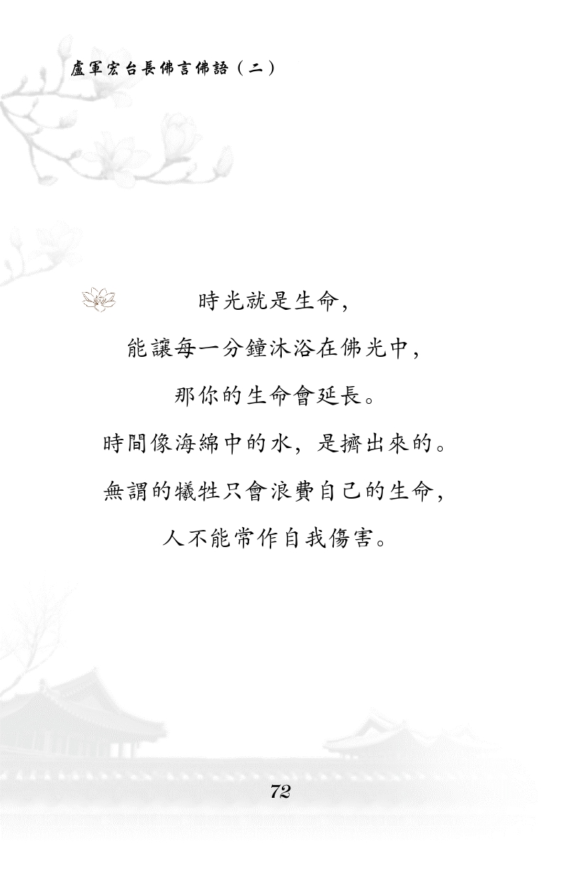不限会员 时光就是生命, 能让每一分钟沐浴在佛光中,那你的生命会延长。 时间像海绵中的水,是挤出来的。无谓的牺牲只会浪费自己的生命,人不能常作自我伤害。 |佛言佛语第二册