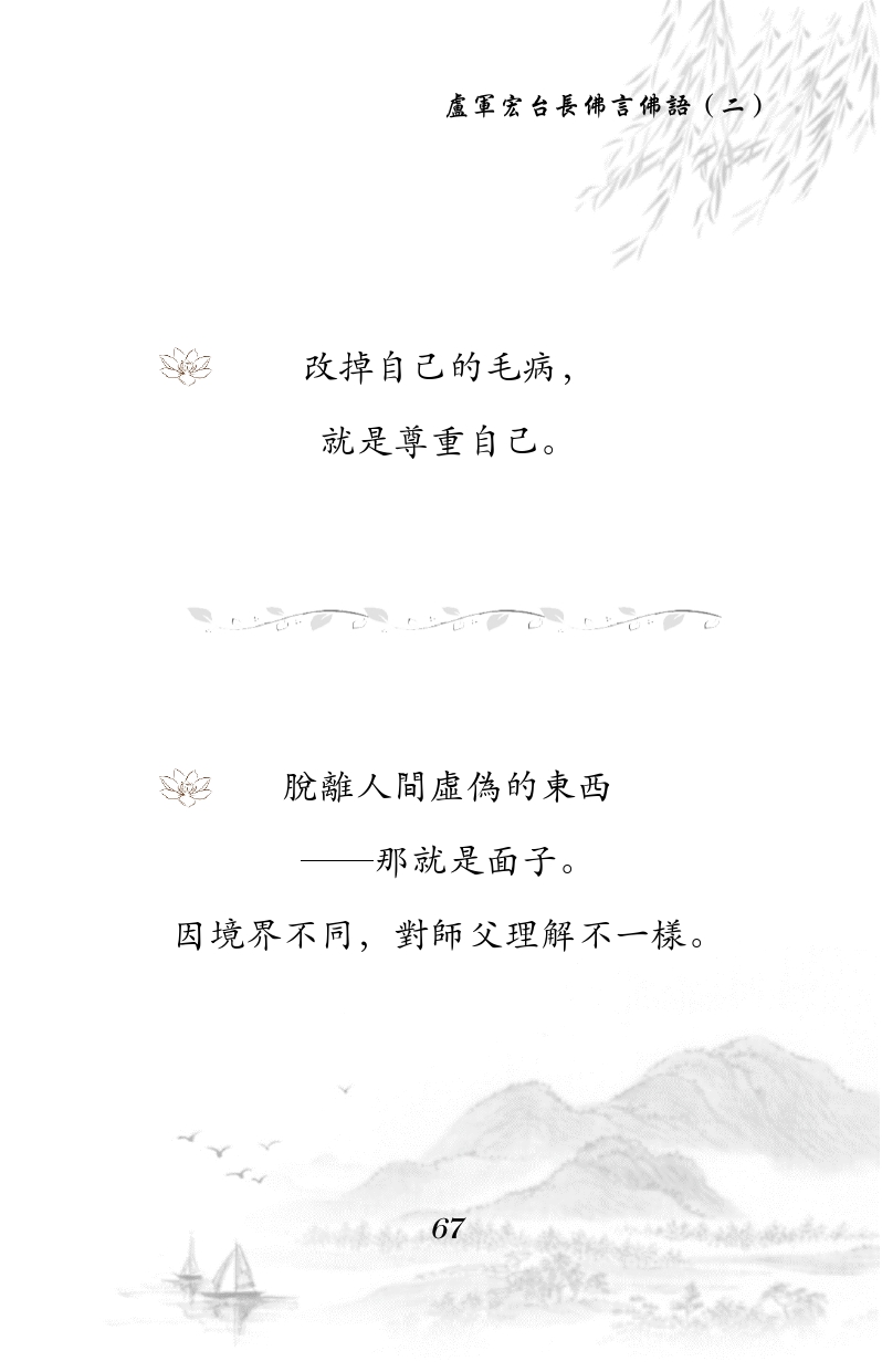 不限会员 改掉自己的毛病,就是尊重自己。 脱离人间虚伪的东西 ——那就是面子。 因境界不同,对师父理解不一样。 |佛言佛语第二册