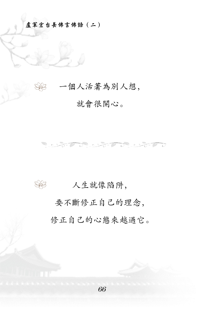不限会员 一个人活着为别人想,就会很开心。 人生就像陷阱, 要不断修正自己的理念, 修正自己的心态来越过它。 |佛言佛语第二册