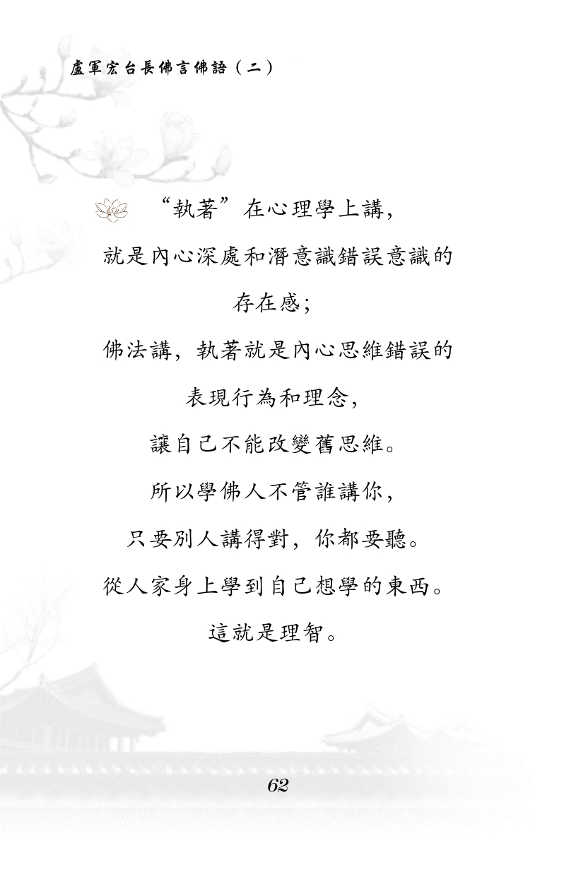不限会员 执着”在心理学上讲, 就是内心深处和潜意识错误意识的存在感; 佛法讲,执着就是内心思维错误的表现行为和理念, 让自己不能改变旧思维。 所以学佛人不管谁讲你, 只要别人讲得对,你都要听。 从人家身上学到自己想学的东西。 这就是理智。 |佛言佛语第二册