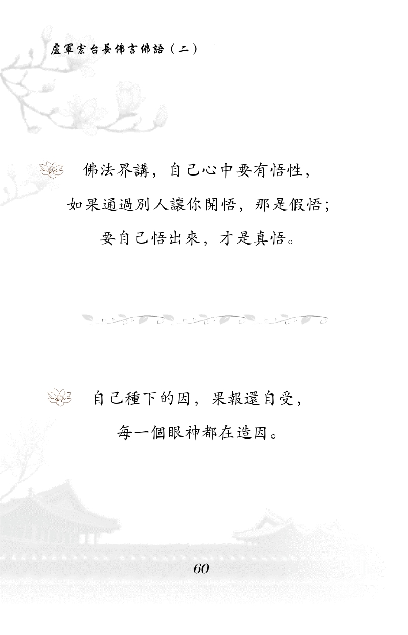 不限会员 佛法界讲,自己心中要有悟性, 如果通过别人让你开悟,那是假悟; 要自己悟出来,才是真悟。 自己种下的因,果报还自受,每一个眼神都在造因。 |佛言佛语第二册