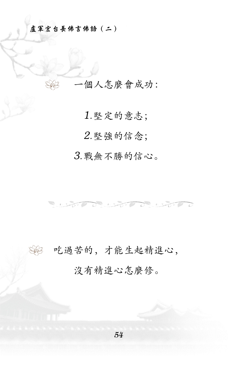 不限会员 一个人怎么会成功: 1.坚定的意志; 2.坚强的信念; 3.战无不胜的信心。 吃过苦的,才能生起精进心, 没有精进心怎么修。 |佛言佛语第二册