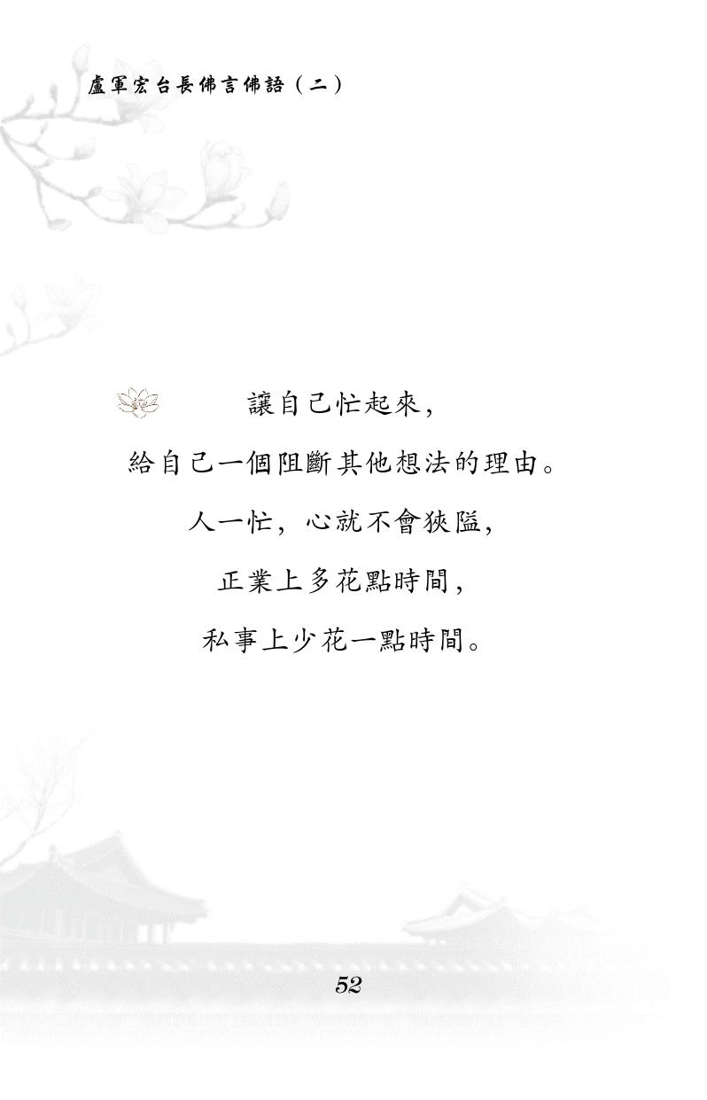 不限会员 让自己忙起来, 给自己一个阻断其他想法的理由。 人一忙,心就不会狭隘, 正业上多花点时间, 私事上少花一点时间。 |佛言佛语第二册