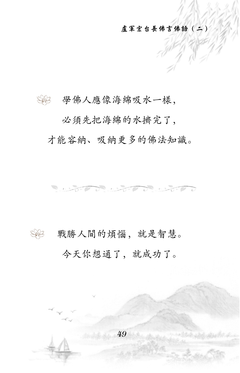 不限会员 学佛人应像海绵吸水一样, 必须先把海绵的水挤完了, 才能容纳、吸纳更多的佛法知识。 战胜人间的烦恼,就是智慧。 今天你想通了,就成功了。 |佛言佛语第二册