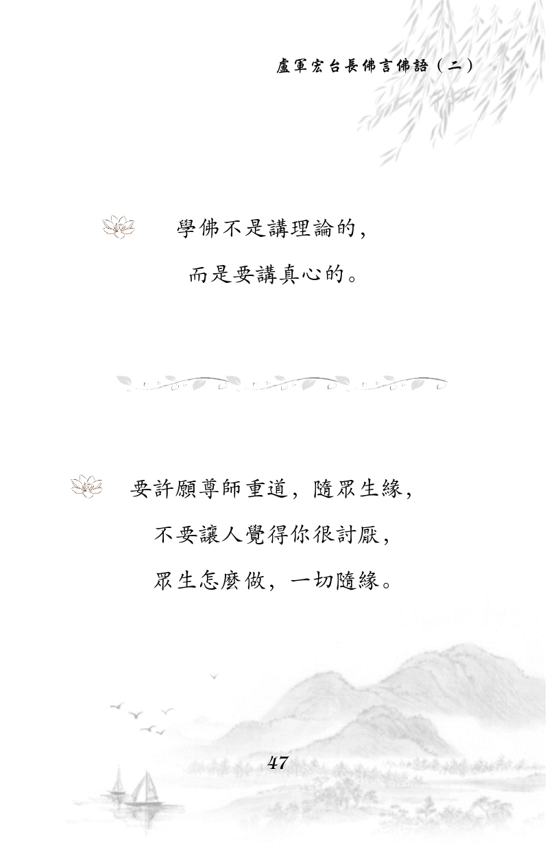 不限会员 学佛不是讲理论的, 而是要讲真心的。 要许愿尊师重道,随众生缘, 不要让人觉得你很讨厌, 众生怎么做,一切随缘。 |佛言佛语第二册