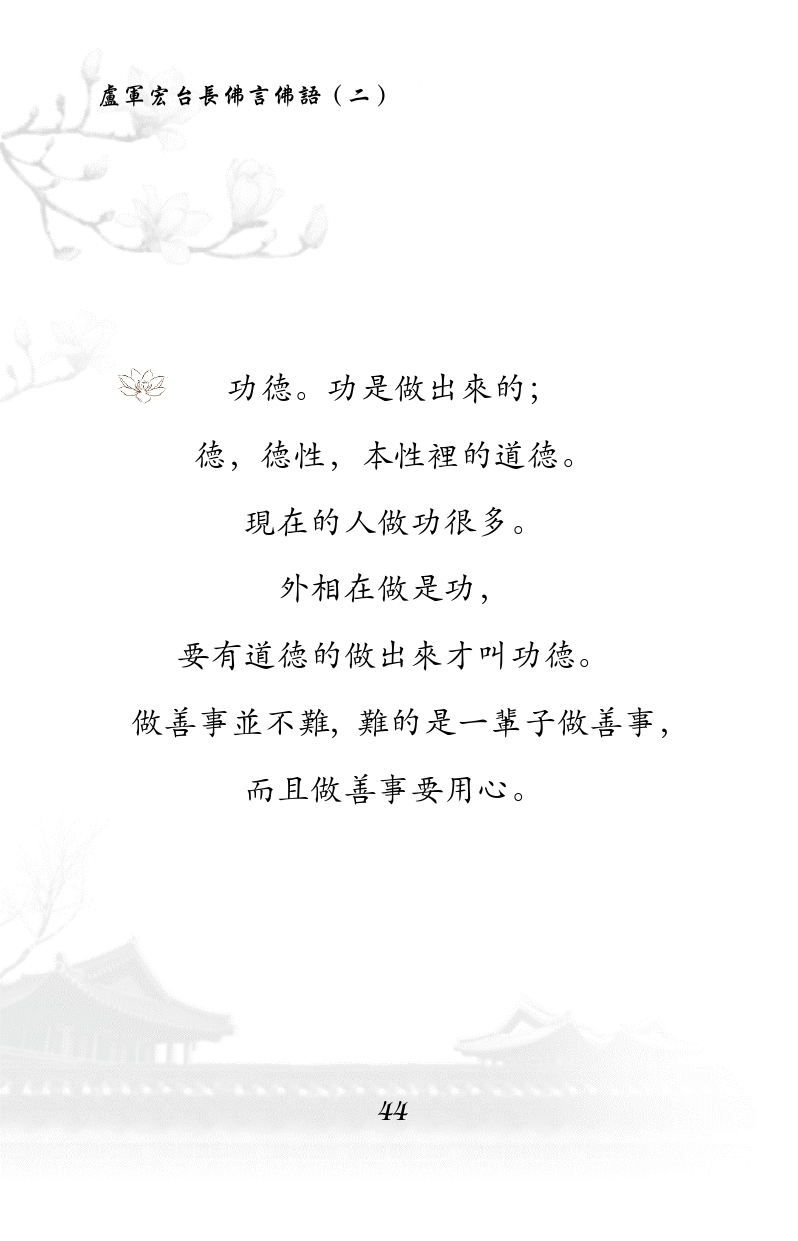 不限会员 功德。功是做出来的; 德,德性,本性里的道德。 现在的人做功很多。 外相在做是功, 要有道德的做出来才叫功德。 做善事并不难,难的是一辈子做善事, 而且做善事要用心。 |佛言佛语第二册