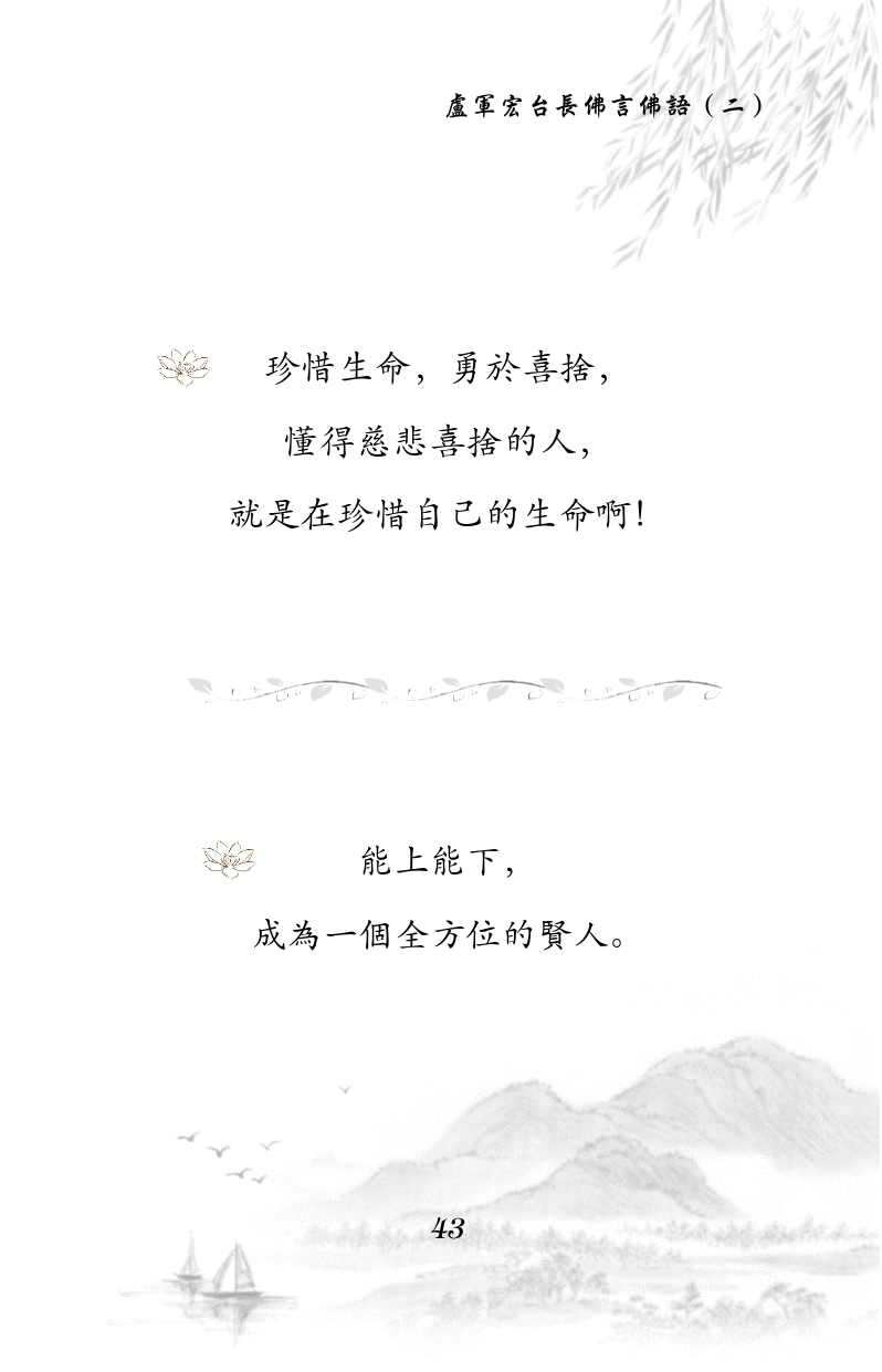 不限会员 珍惜生命,勇于喜舍, 懂得慈悲喜舍的人, 就是在珍惜自己的生命啊! 能上能下, 成为一个全方位的贤人。 |佛言佛语第二册