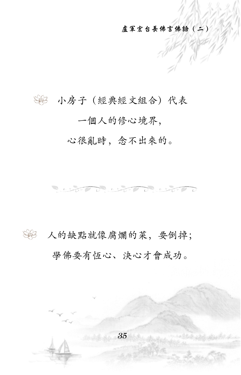 不限会员 小房子(经典经文组合)代表一个人的修心境界, 心很乱时,念不出来的。 人的缺点就像腐烂的菜, 要倒掉;学佛要有恒心、决心才会成功。 |佛言佛语第二册