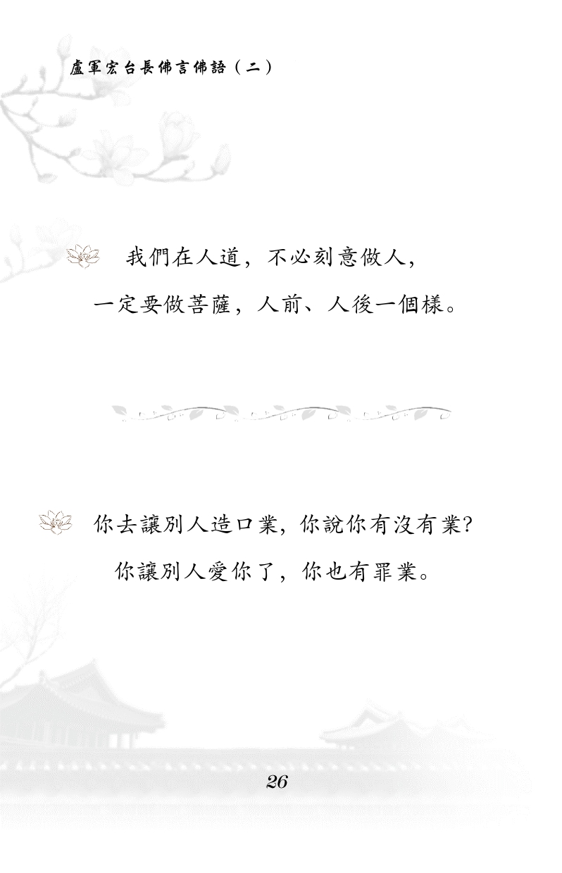 不限会员 我们在人道,不必刻意做人, 一定要做菩萨, 人前、人后一个样。 你去让别人造口业, 你说你有没有业? 你让别人爱你了, 你也有罪业。 |佛言佛语第二册