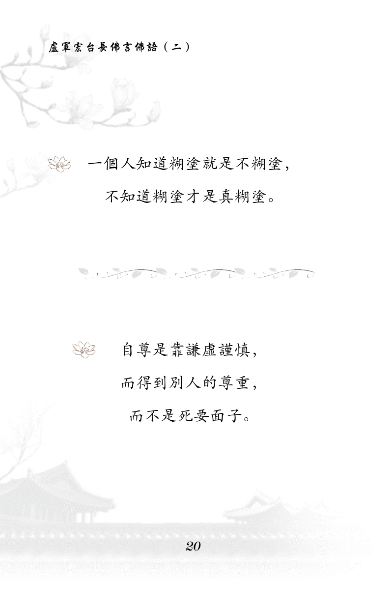 不限会员 一个人知道糊涂就是不糊涂, 不知道糊涂才是真糊涂。 自尊是靠谦虚谨慎, 而得到别人的尊重, 而不是死要面子。 |佛言佛语第二册
