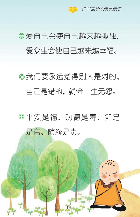 不限会员 爱自己会使自己越来越孤独, 爱众生会使自己越来越幸福。 我们要永远觉得别人是对的、自己是错的,就会一生无怨。 平安是福、功德是寿、知足是富、随缘是贵。 |佛言佛语第一册
