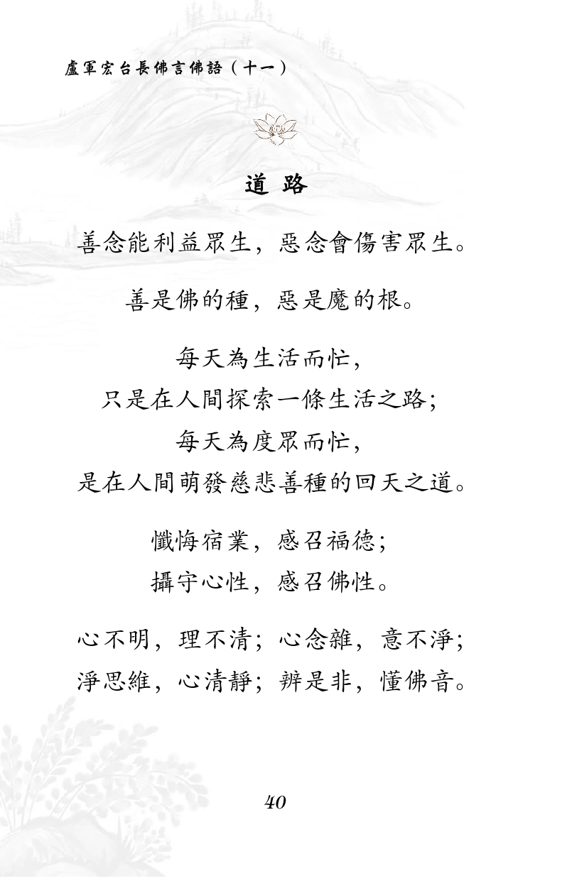 不限会员 正信正念 学佛人要追寻内心世界真正的财富, 那就是我们的智慧和般若。 在人间,任何追求名利的人, 或者把名利看得很重的人, 都会把自己的人格看得很轻。 懂得舍弃人间的名闻利养, 那你的心才称为“开悟”。 学佛人如果去传一些 道听途说的消息, 或讲一些无中生有的事情, 在佛法界,称作意识犯戒 (内心诽谤)。 |佛言佛语(十)
