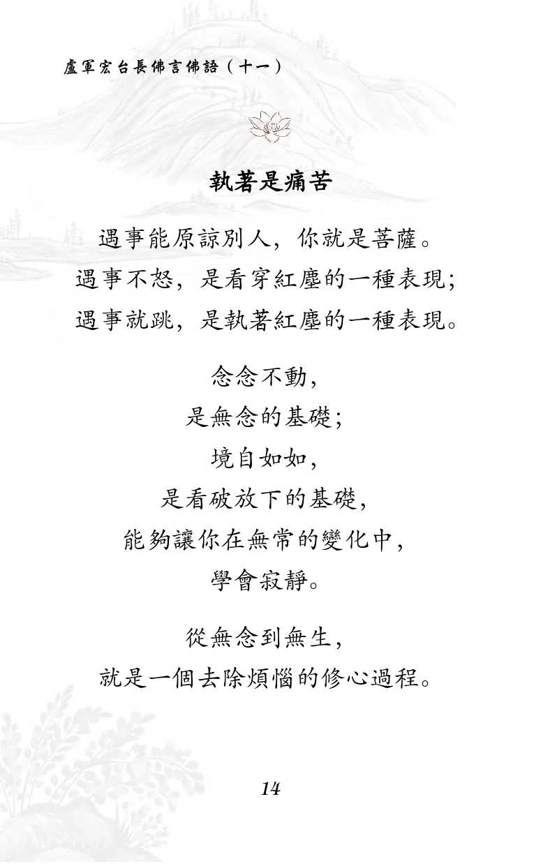 不限会员 有智慧的学佛人, 把一切都看成是缘分, 既来之则安之。 只有这样处理, 你浮躁的心情,才能静下来。 师父写的“净心” 那两点象是扫帚, 就是要扫除你争斗的心, 你的心才能变得干净。 人生就是在风雨中兼程; 学佛就是在挫折中精进。 心宽的人能够包容一切; 慈悲的人能够放下一切。 |佛言佛语(十)
