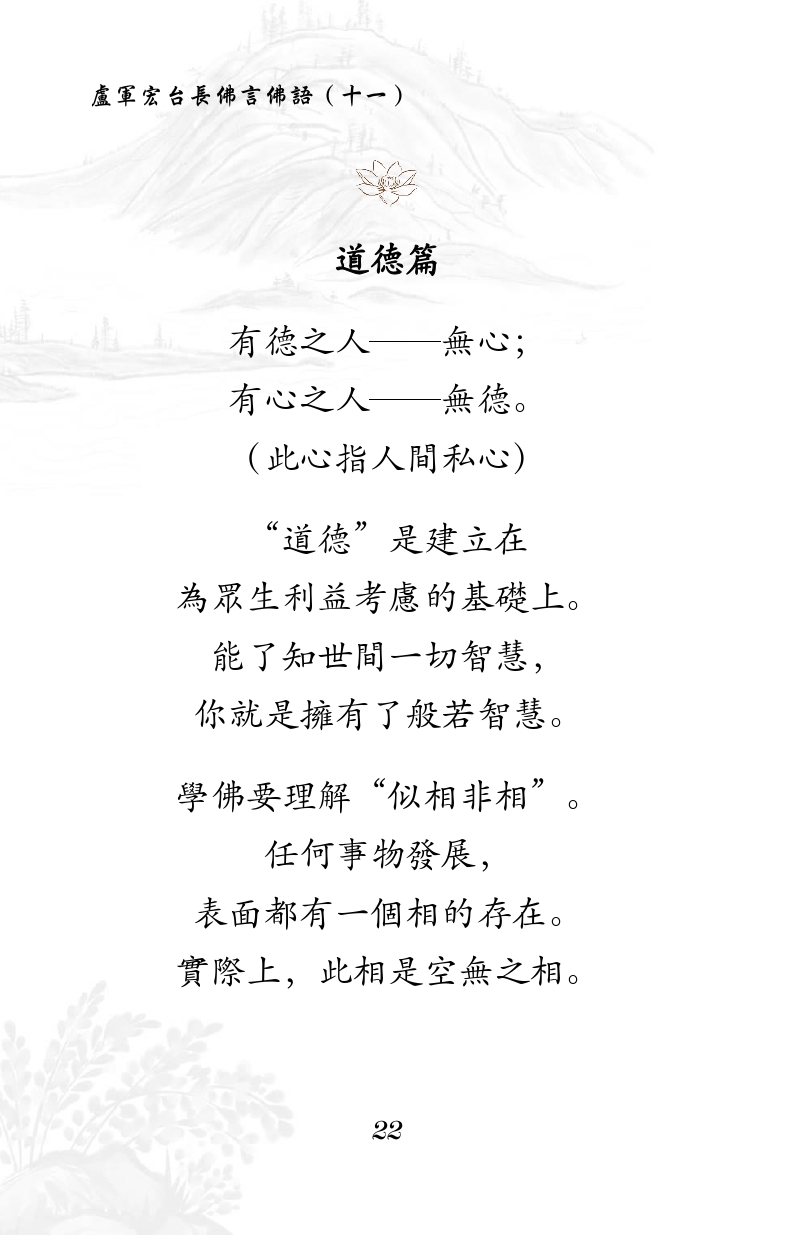 不限会员 道德篇 有德之人——无心; 有心之人——无德。 (此心指人间私心) “道德”是建立在 为众生利益考虑的基础上。 能了知世间一切智慧, 你就是拥有了般若智慧。 学佛要理解“似相非相”。 任何事物发展, 表面都有一个相的存在。 实际上,此相是空无之相。 |佛言佛语(十一)