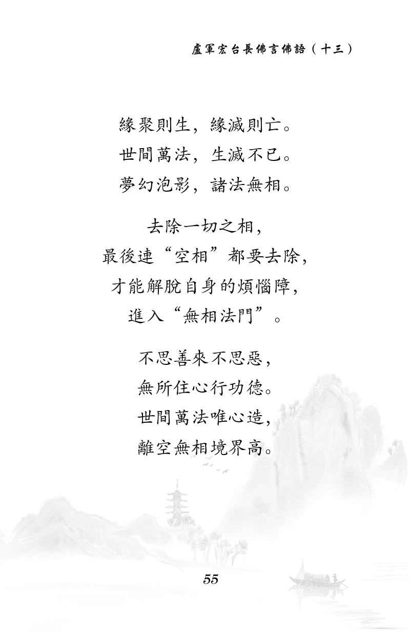 不限会员 緣聚則生,緣滅則亡。 世間萬法,生滅不已。 夢幻泡影,諸法無相。 去除一切之相, 最後連“空相”都要去除, 才能解脫自身的煩惱障, 進入“無相法門”。 不思善來不思惡, 無所住心行功德。 世間萬法唯心造, 離空無相境界高。 |佛言佛语(十三)