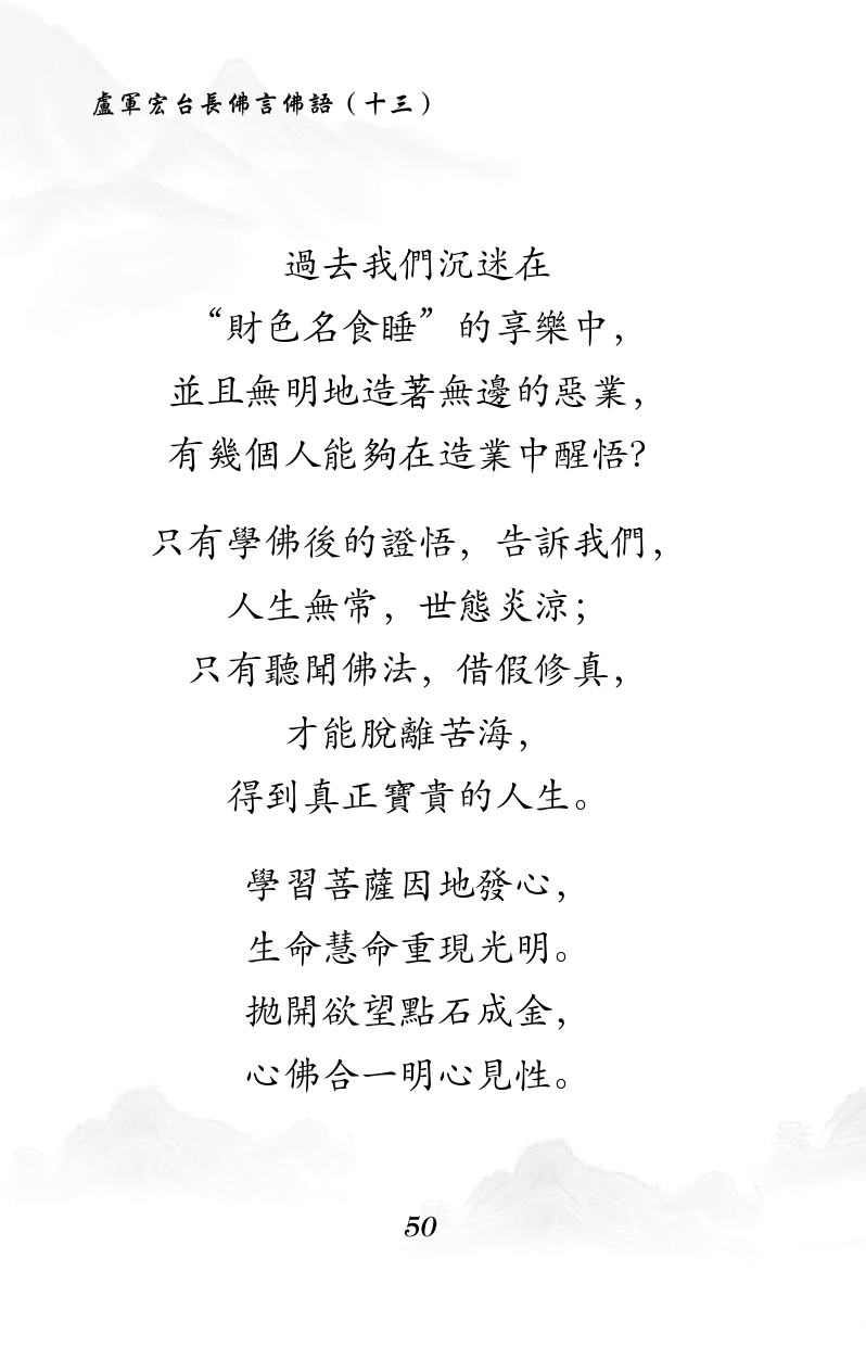 不限会员 過去我們沉迷在 “財色名食睡”的享樂中, 並且無明地造著無邊的惡業, 有幾個人能夠在造業中醒悟? 只有學佛後的證悟,告訴我們, 人生無常,世態炎涼; 只有聽聞佛法,借假修真, 才能脫離苦海, 得到真正寶貴的人生。 學習菩薩因地發心, 生命慧命重現光明。 拋開欲望點石成金, 心佛合一明心見性。 |佛言佛语(十三)