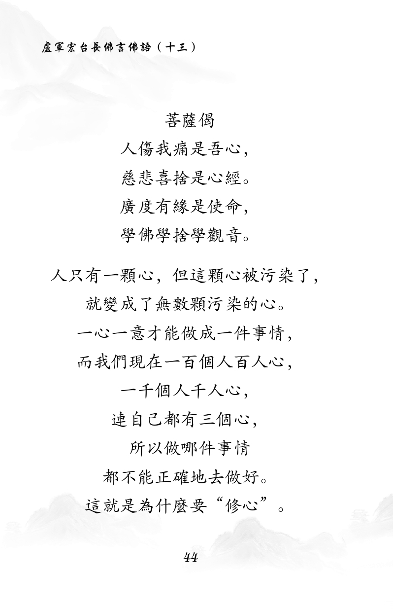 不限会员 菩薩偈 人傷我痛是吾心, 慈悲喜捨是心經。 廣度有緣是使命, 學佛學捨學觀音。 人只有一顆心,但這顆心被污染了, 就變成了無數顆污染的心。 一心一意才能做成一件事情, 而我們現在一百個人百人心, 一千個人千人心, 連自己都有三個心, 所以做哪件事情 都不能正確地去做好。 這就是為什麼要“修心”。 |佛言佛语(十三)