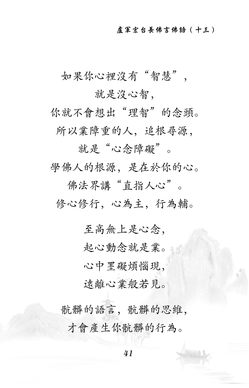 不限会员 如果你心裡沒有“智慧”, 就是沒心智, 你就不會想出“理智”的念頭。 所以業障重的人,追根尋源, 就是“心念障礙”。 學佛人的根源,是在於你的心。 佛法界講“直指人心”。 修心修行,心為主,行為輔。 至高無上是心念, 起心動念就是業。 心中罣礙煩惱現, 遠離心業般若見。 骯髒的語言,骯髒的思維, 才會產生你骯髒的行為。 |佛言佛语(十三)