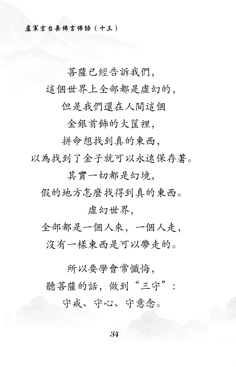 不限会员 菩薩已經告訴我們, 這個世界上全部都是虛幻的, 但是我們還在人間這個 金銀首飾的大筐裡, 拼命想找到真的東西, 以為找到了金子就可以永遠保存著。 其實一切都是幻境, 假的地方怎麼找得到真的東西。 虛幻世界, 全部都是一個人來,一個人走, 沒有一樣東西是可以帶走的。 所以要學會常懺悔, 聽菩薩的話,做到“三守”: 守戒、守心、守意念。 |佛言佛语(十三)