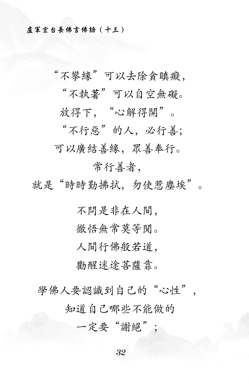 不限会员 “不攀緣”可以去除貪瞋癡, “不執著”可以自空無礙。 放得下,“心解得開”。 “不行惡”的人,必行善; 可以廣結善緣,眾善奉行。 常行善者, 就是“時時勤拂拭,勿使惹塵埃”。 不問是非在人間, 徹悟無常莫等閒。 人間行佛般若道, 勸醒迷途菩薩靠。 學佛人要認識到自己的“心性”, 知道自己哪些不能做的 一定要“謝絕”; |佛言佛语(十三)