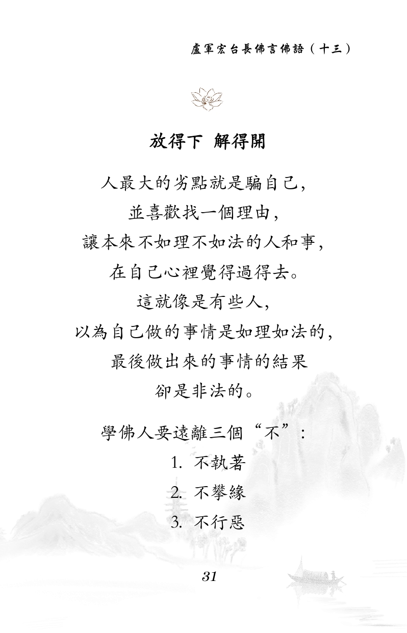 不限会员 放得下 解得開 人最大的劣點就是騙自己, 並喜歡找一個理由, 讓本來不如理不如法的人和事, 在自己心裡覺得過得去。 這就像是有些人, 以為自己做的事情是如理如法的, 最後做出來的事情的結果 卻是非法的。 學佛人要遠離三個“不”: 1. 不執著 2. 不攀緣 3. 不行惡 |佛言佛语(十三)