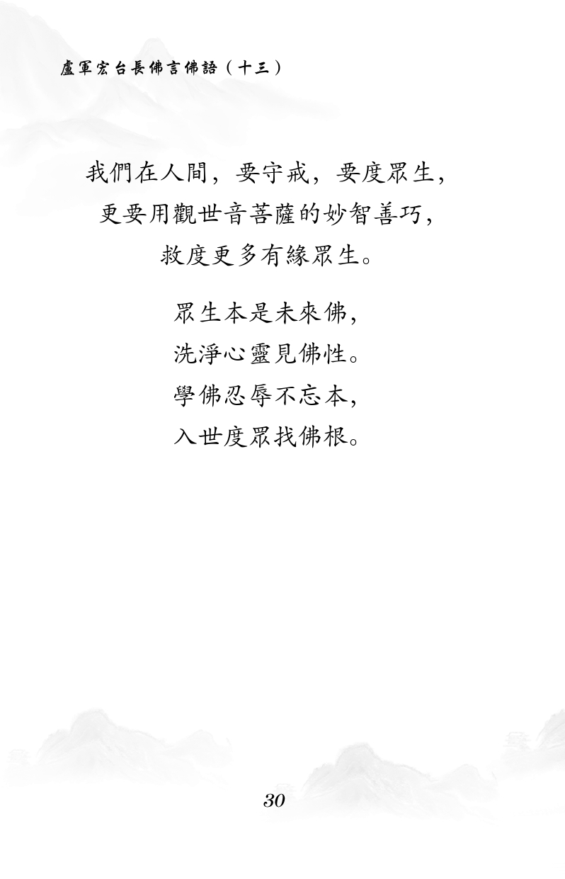 不限会员 我們在人間,要守戒,要度眾生, 更要用觀世音菩薩的妙智善巧, 救度更多有緣眾生。 眾生本是未來佛, 洗淨心靈見佛性。 學佛忍辱不忘本, 入世度眾找佛根。 |佛言佛语(十三)