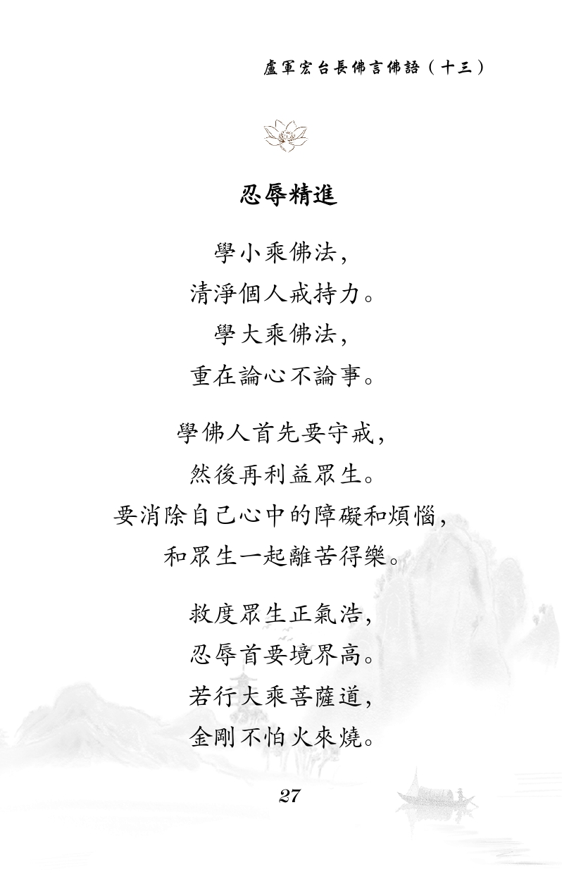 不限会员 忍辱精進 學小乘佛法, 清淨個人戒持力。 學大乘佛法, 重在論心不論事。 學佛人首先要守戒, 然後再利益眾生。 要消除自己心中的障礙和煩惱, 和眾生一起離苦得樂。 救度眾生正氣浩, 忍辱首要境界高。 若行大乘菩薩道, 金剛不怕火來燒。 |佛言佛语(十三)