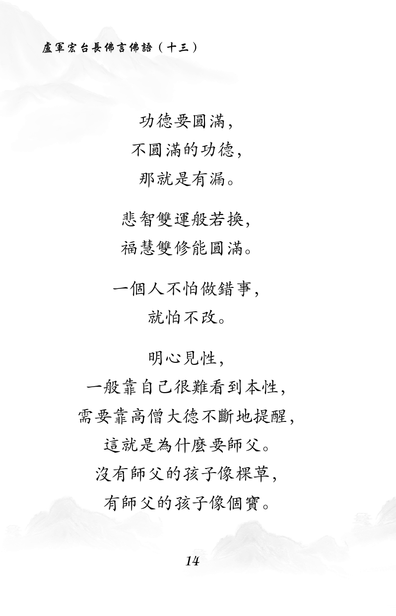 不限会员 功德要圓滿, 不圓滿的功德, 那就是有漏。 悲智雙運般若換, 福慧雙修能圓滿。 一個人不怕做錯事, 就怕不改。 明心見性, 一般靠自己很難看到本性, 需要靠高僧大德不斷地提醒, 這就是為什麼要師父。 沒有師父的孩子像棵草, 有師父的孩子像個寶。 |佛言佛语(十三)