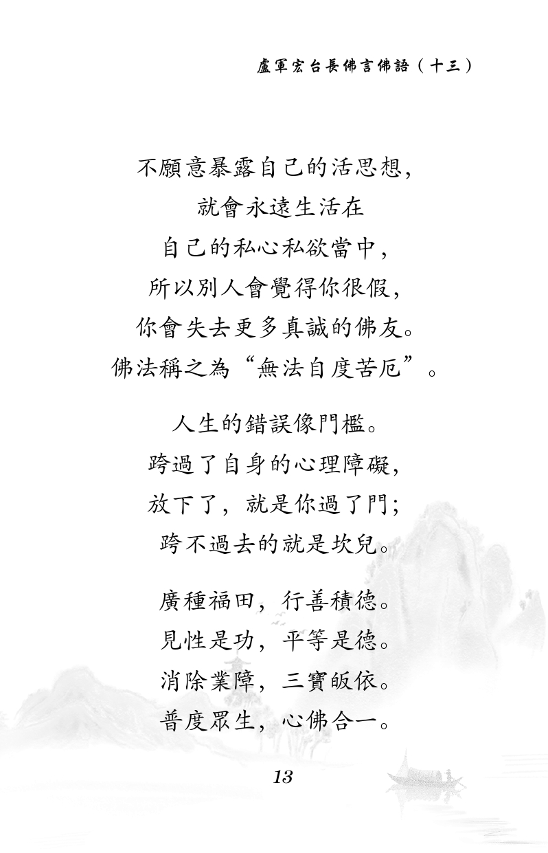 不限会员 不願意暴露自己的活思想, 就會永遠生活在 自己的私心私欲當中, 所以別人會覺得你很假, 你會失去更多真誠的佛友。 佛法稱之為“無法自度苦厄”。 人生的錯誤像門檻。 跨過了自身的心理障礙, 放下了,就是你過了門; 跨不過去的就是坎兒。 廣種福田,行善積德。 見性是功,平等是德。 消除業障,三寶皈依。 普度眾生,心佛合一。 |佛言佛语(十三)