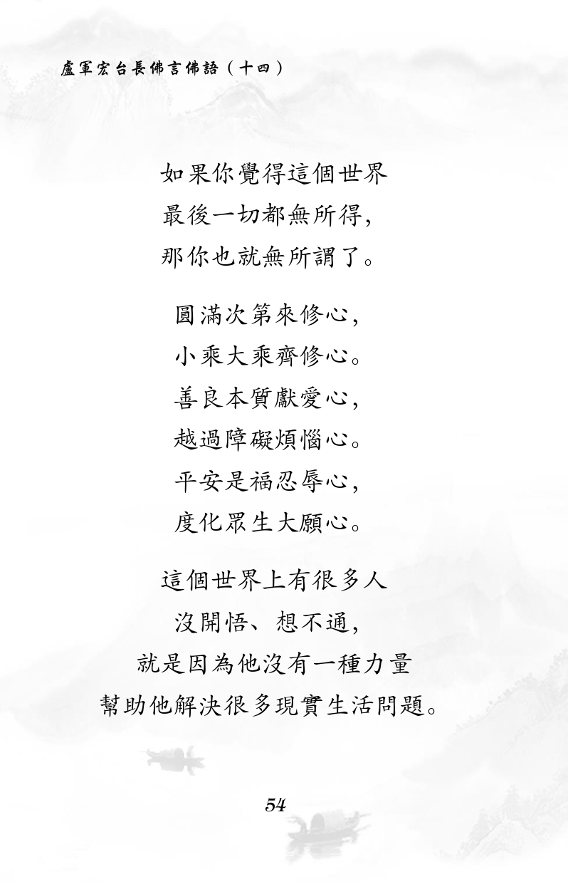 不限会员 如果你覺得這個世界 最後一切都無所得, 那你也就無所謂了。 圓滿次第來修心, 小乘大乘齊修心。 善良本質獻愛心, 越過障礙煩惱心。 平安是福忍辱心, 度化眾生大願心。 這個世界上有很多人 沒開悟、想不通, 就是因為他沒有一種力量 幫助他解決很多現實生活問題。 |佛言佛语(十四)