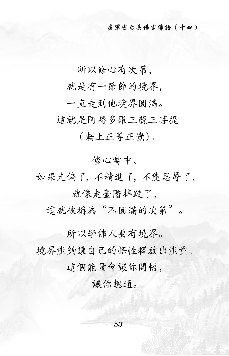 不限会员 所以修心有次第, 就是有一節節的境界, 一直走到他境界圓滿。 這就是阿耨多羅三藐三菩提 (無上正等正覺)。 修心當中, 如果走偏了,不精進了,不能忍辱了, 就像走臺階摔跤了, 這就被稱為“不圓滿的次第”。 所以學佛人要有境界。 境界能夠讓自己的悟性釋放出能量。 這個能量會讓你開悟, 讓你想通。 |佛言佛语(十四)