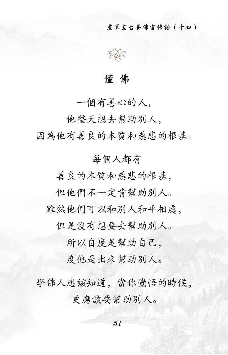不限会员 懂 佛 一個有善心的人, 他整天想去幫助別人, 因為他有善良的本質和慈悲的根基。 每個人都有 善良的本質和慈悲的根基, 但他們不一定肯幫助別人。 雖然他們可以和別人和平相處, 但是沒有想要去幫助別人。 所以自度是幫助自己, 度他是出來幫助別人。 學佛人應該知道,當你覺悟的時候, 更應該要幫助別人。 |佛言佛语(十四)