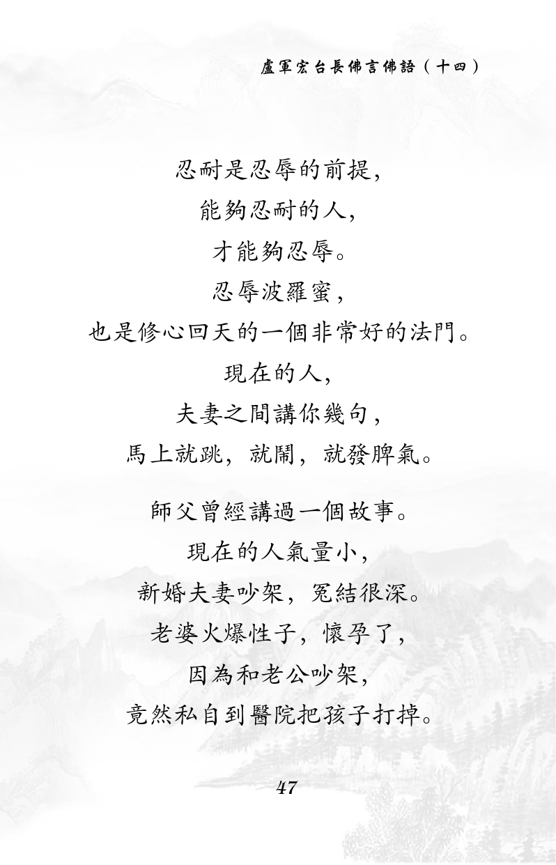 不限会员 忍耐是忍辱的前提, 能夠忍耐的人, 才能夠忍辱。 忍辱波羅蜜, 也是修心回天的一個非常好的法門。 現在的人, 夫妻之間講你幾句, 馬上就跳,就鬧,就發脾氣。 師父曾經講過一個故事。 現在的人氣量小, 新婚夫妻吵架,冤結很深。 老婆火爆性子,懷孕了, 因為和老公吵架, 竟然私自到醫院把孩子打掉。 |佛言佛语(十四)