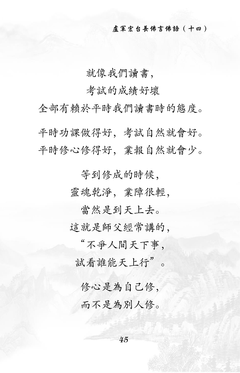 不限会员 就像我們讀書, 考試的成績好壞 全部有賴於平時我們讀書時的態度。 平時功課做得好,考試自然就會好。 平時修心修得好,業報自然就會少。 等到修成的時候, 靈魂乾淨,業障很輕, 當然是到天上去。 這就是師父經常講的, “不爭人間天下事, 試看誰能天上行”。 修心是為自己修, 而不是為別人修。 |佛言佛语(十四)