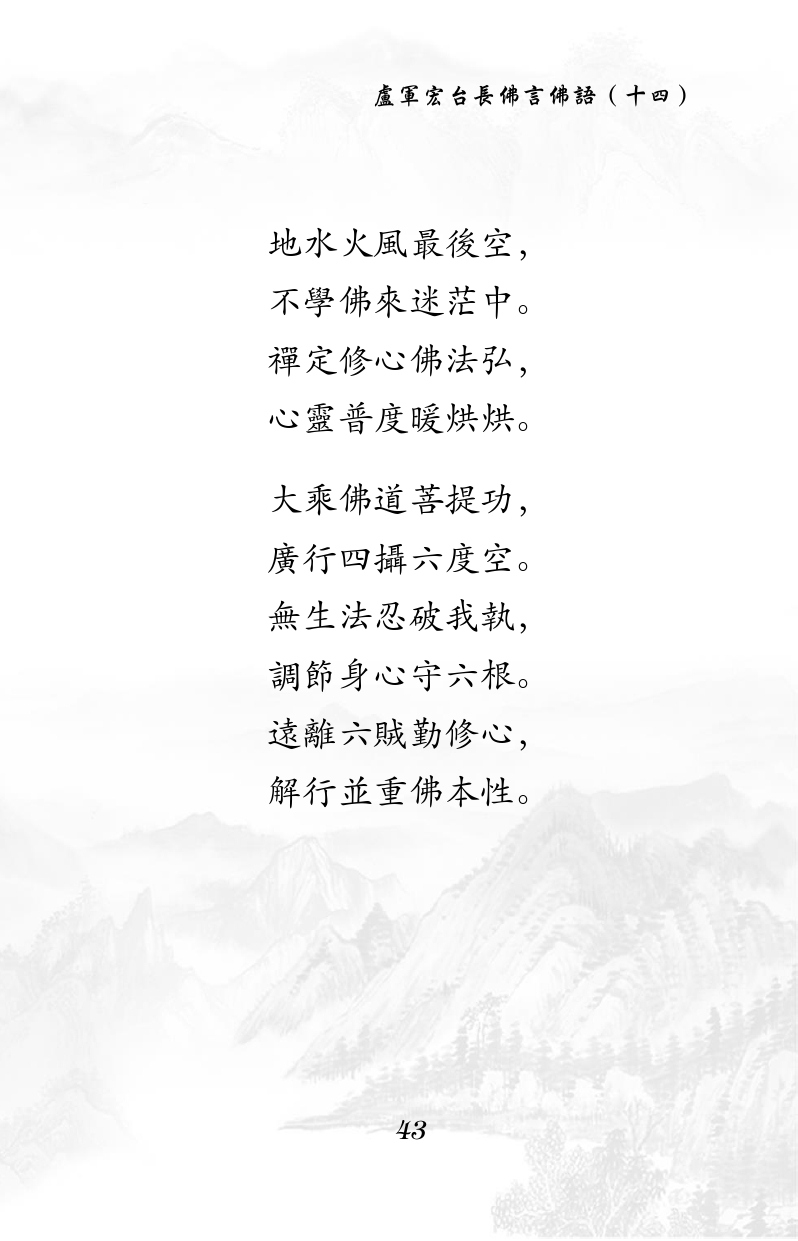 不限会员 地水火風最後空, 不學佛來迷茫中。 禪定修心佛法弘, 心靈普度暖烘烘。 大乘佛道菩提功, 廣行四攝六度空。 無生法忍破我執, 調節身心守六根。 遠離六賊勤修心, 解行並重佛本性。 |佛言佛语(十四)