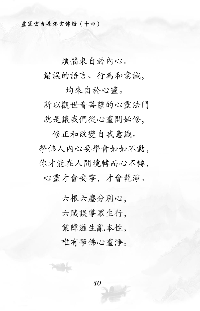 不限会员 煩惱來自於內心。 錯誤的語言、行為和意識, 均來自於心靈。 所以觀世音菩薩的心靈法門 就是讓我們從心靈開始修, 修正和改變自我意識。 學佛人內心要學會如如不動, 你才能在人間境轉而心不轉, 心靈才會安寧,才會乾淨。 六根六塵分別心, 六賊誤導眾生行, 業障滋生亂本性, 唯有學佛心靈淨。 |佛言佛语(十四)