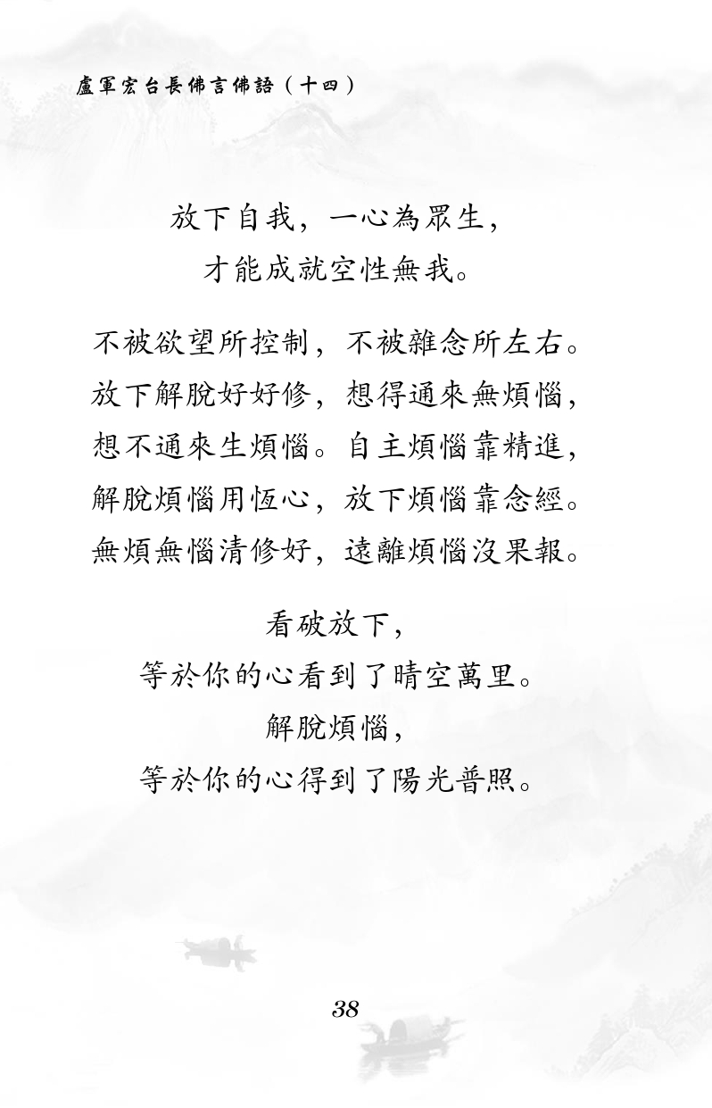 不限会员 放下自我,一心為眾生, 才能成就空性無我。 不被欲望所控制,不被雜念所左右。 放下解脫好好修,想得通來無煩惱, 想不通來生煩惱。自主煩惱靠精進, 解脫煩惱用恆心,放下煩惱靠念經。 無煩無惱清修好,遠離煩惱沒果報。 看破放下, 等於你的心看到了晴空萬里。 解脫煩惱, 等於你的心得到了陽光普照。 |佛言佛语(十四)