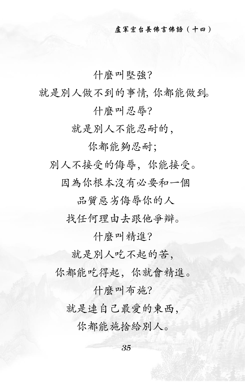 不限会员 什麼叫堅強? 就是別人做不到的事情,你都能做到。 什麼叫忍辱? 就是別人不能忍耐的, 你都能夠忍耐; 別人不接受的侮辱,你能接受。 因為你根本沒有必要和一個 品質惡劣侮辱你的人 找任何理由去跟他爭辯。 什麼叫精進? 就是別人吃不起的苦, 你都能吃得起,你就會精進。 什麼叫布施? 就是連自己最愛的東西, 你都能施捨給別人。 |佛言佛语(十四)