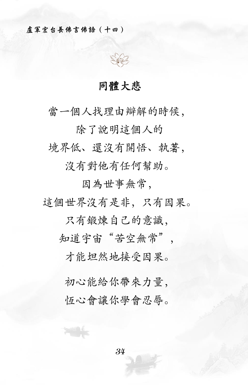 不限会员 同體大悲 當一個人找理由辯解的時候, 除了說明這個人的 境界低、還沒有開悟、執著, 沒有對他有任何幫助。 因為世事無常, 這個世界沒有是非,只有因果。 只有鍛煉自己的意識, 知道宇宙“苦空無常”, 才能坦然地接受因果。 初心能給你帶來力量, 恆心會讓你學會忍辱。 |佛言佛语(十四)