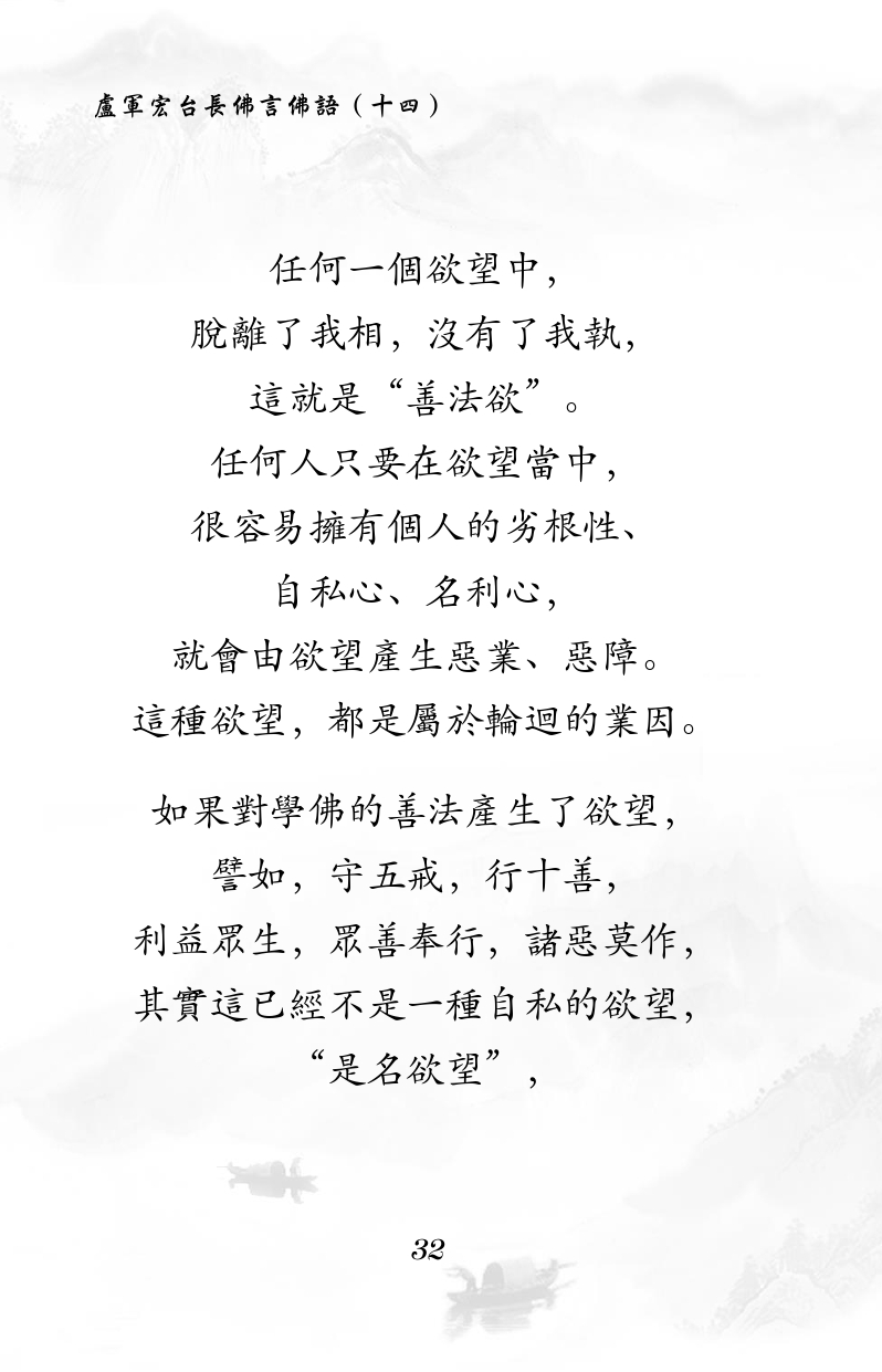 不限会员 任何一個欲望中, 脫離了我相,沒有了我執, 這就是“善法欲”。 任何人只要在欲望當中, 很容易擁有個人的劣根性、 自私心、名利心, 就會由欲望產生惡業、惡障。 這種欲望,都是屬於輪迴的業因。 如果對學佛的善法產生了欲望, 譬如,守五戒,行十善, 利益眾生,眾善奉行,諸惡莫作, 其實這已經不是一種自私的欲望, “是名欲望”, |佛言佛语(十四)