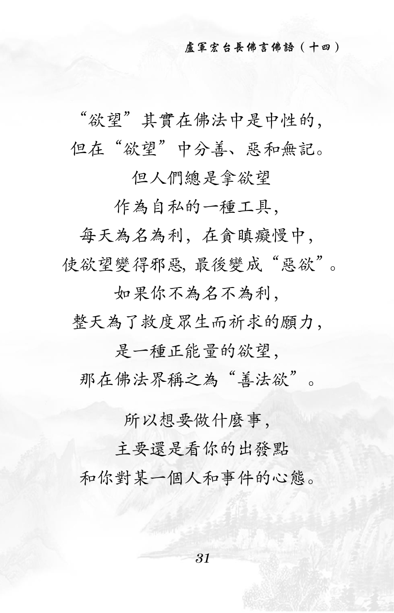 不限会员 “欲望”其實在佛法中是中性的, 但在“欲望”中分善、惡和無記。 但人們總是拿欲望 作為自私的一種工具, 每天為名為利,在貪瞋癡慢中, 使欲望變得邪惡,最後變成“惡欲”。 如果你不為名不為利, 整天為了救度眾生而祈求的願力, 是一種正能量的欲望, 那在佛法界稱之為“善法欲”。 所以想要做什麼事, 主要還是看你的出發點 和你對某一個人和事件的心態。 |佛言佛语(十四)