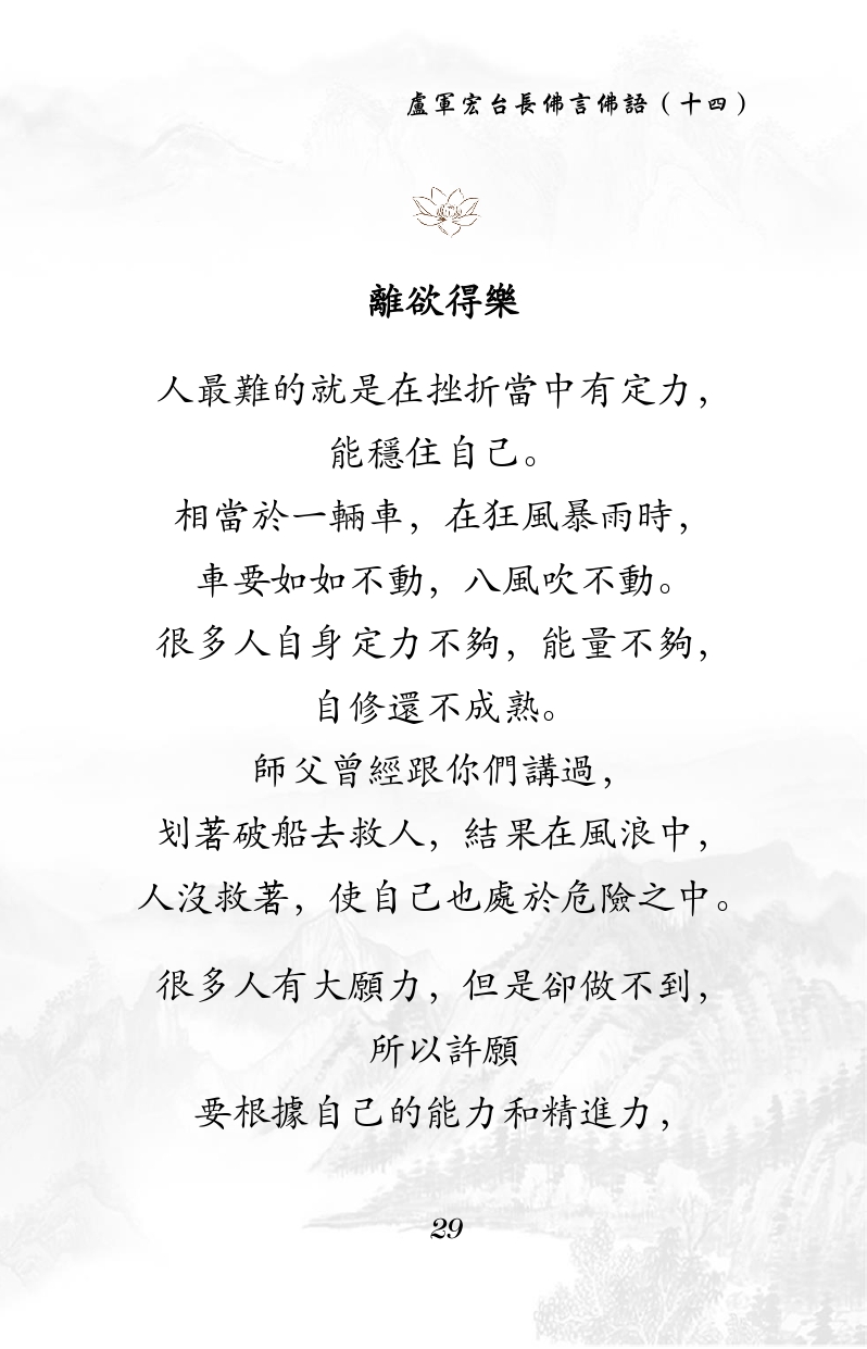 不限会员 離欲得樂 人最難的就是在挫折當中有定力, 能穩住自己。 相當於一輛車,在狂風暴雨時, 車要如如不動,八風吹不動。 很多人自身定力不夠,能量不夠, 自修還不成熟。 師父曾經跟你們講過, 划著破船去救人,結果在風浪中, 人沒救著,使自己也處於危險之中。 很多人有大願力,但是卻做不到, 所以許願 要根據自己的能力和精進力, |佛言佛语(十四)